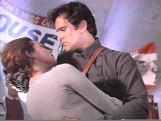 Ash holding a frightened women in his arms and the line "Hail