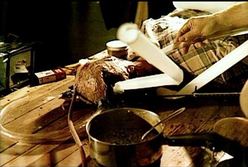 a series of blood bags. The scene required Ash to shoot the possessed
