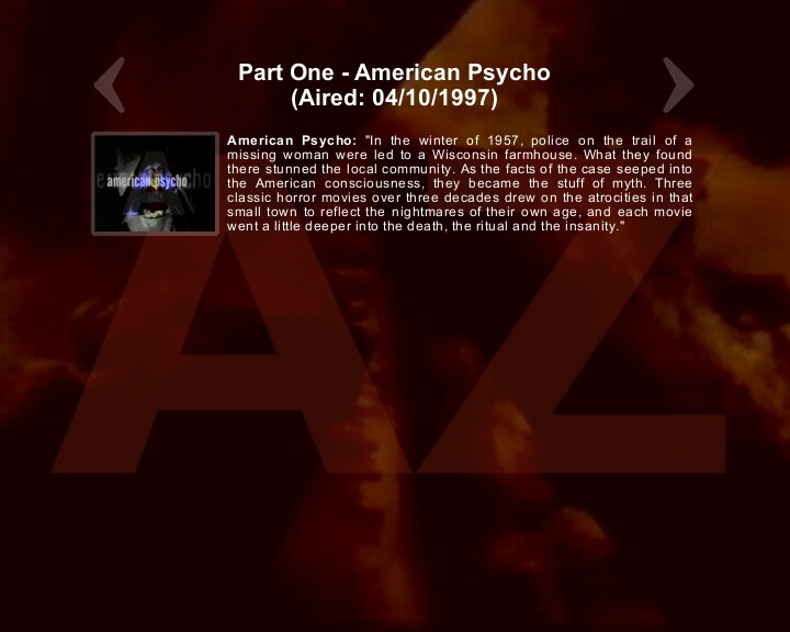 A for American Psycho:"In the winter of 1957, police on the trail of a missing woman were led to a Wisconsin farmhouse. What they found there stunned the local community. As the facts of the case seeped into the American consciousness, they became the stuff of myth. Three classic horror movies over three decades drew on the atrocities in that small town to reflect the nightmares of their own age, and each movie went a little deeper into the death, the ritual and the insanity."