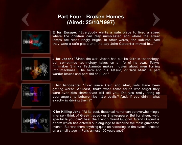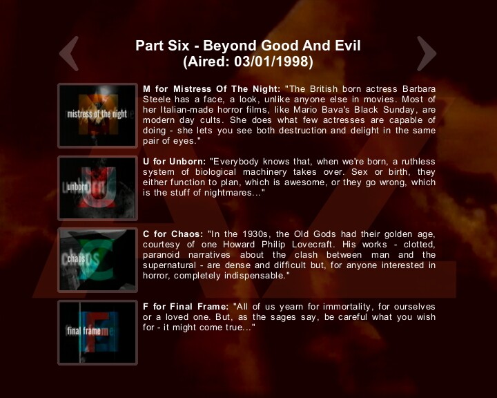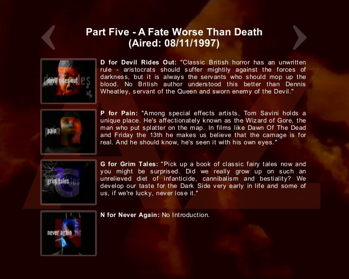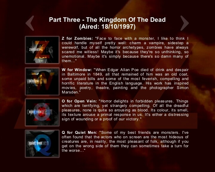 It was a documentary series written and hosted by Clive Barker, exploring the history of horror, from the cinema to art. A tie-in book was also released featuring art work by Clive along with film reviews by Stephen Jones. While there are twenty-six chapters in the book, the six-part series had just twenty-one segments, two of which were different to those in the book. Each of the segments (with the exception of that dealing with The Crow (N for Never Again in the TV series but included within Z for Zombie in the book) was introduced by Clive and he also narrated a number of the segments. You can see how each letter was titled & introduced from the list below.