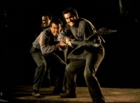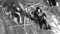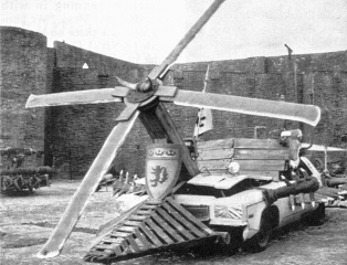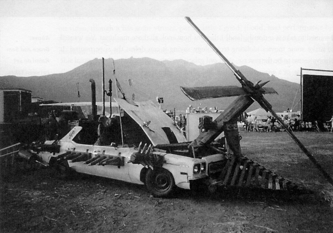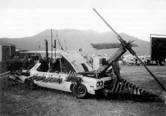 Air rams attached to stuntmen were used along with pyrotechnics to simulate explosions, and the ensuring action. Some larger and some smaller rams were used, the largest of which could pull someone forty feet high. Parts of the 'Deathcoaster' sequence also came under Chris' remit. This was a heavily modified Delta 88 Oldsmobile, although not Sam's prized original of course. His involvement was the Deadites hit by the helicopter blades, which was again achieved via air rams. He had three stuntmen each hooked up to a line so they could run five to six feet into shot, then the line would go tight which would trigger a solenoid/switch which engaged the air ram and jerked them out of shot as if hit by the helicopter blades. The spinning blades were a physical on-set effect, so the shot was filmed at a particular angle to hide the safety gap left between the blades and stuntmen.