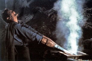 Alterian also handled the physical good/bad Ash split makeup effects. Three mechanical heads were constructed with varying degrees of expression, which could be fixed to a shoulder harness worn by Bruce. To keep up the illusion, he had one arm hidden inside the harness which he could use to control of the fake arm, and had to keep his body tilted over to the right to make himself look even, given his much wider left shoulder. A second opposite harness was produced to allow Bruce to play the heads of both bad and good Ash. Animation took over when both Ashes fall to the ground sprouting extra limbs, but stuntmen were hung side by side for certain closeups. Probably the most memorable set of makeups involved Ashes escape from the book 'vortex' and his resultant deformities. All this was achieved with prosthetics, which involved facial appliances and elbow length foam 'gloves'.