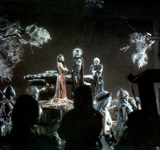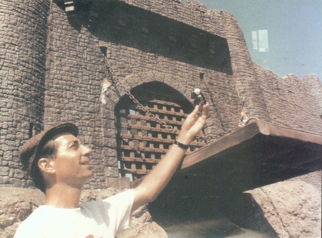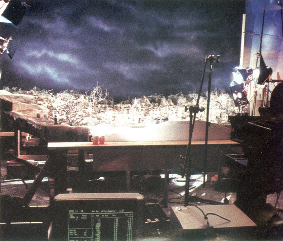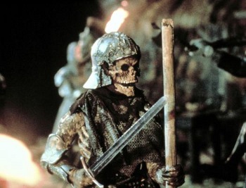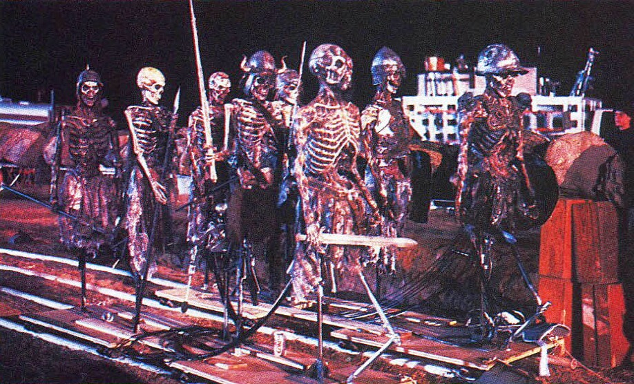 Just to further mix the effects, certain sequences intercut animated footage with on-set mechanical effects to trick the audience, such as Ash escaping the graveyard, and Ash sword fighting with the skeletons. Introvision could also utilize a motion control camera rig, so camera movements & motion used in shooting the background plates and models could then be repeated exactly when shooting the live action footage allowing seamless blending & camera movement between the two.