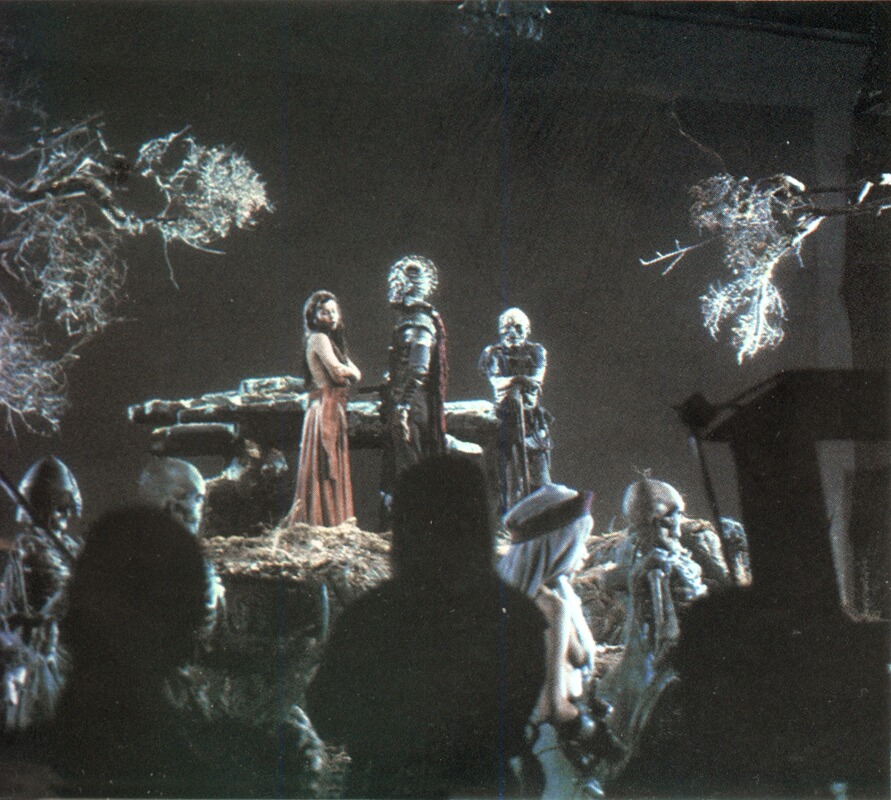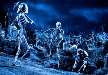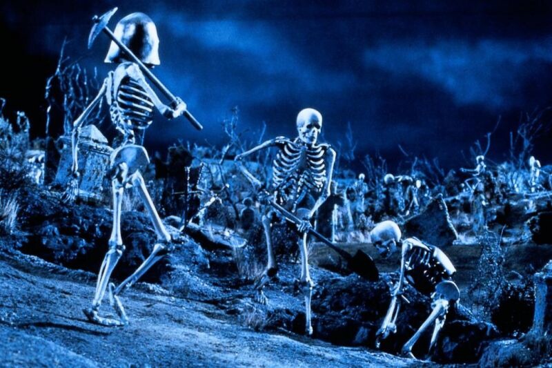 Post-production also included a number of stop-motion animations sequences, some of which were then combined with live action using Introvision. Pete Kleinow produced most of the animated footage, including part of the good/bad Ash sequence, featuring the Ash spidery puppet with four arms and four legs, and the Ray Harryhausen like skeletons.