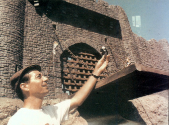 Once all the exterior material had been completed, the production re-located to the Introvision International inc stages in west Hollywood, where they could begin the Introvision process which was overseen by Bill Mesa (Introvision's visual effects supervisor) and took around seven weeks. Introvision is a variation on the standard rear-screen projection process, allowing a background with additional foreground elements which an live actor can interact with. The complex itself consisted of four stages including a small one for close-up shots. This meant that while one stage setup was being used, another stage could be being prepped. Continual rotation allowed them to turn out anything up to four shots in a day depending on their complexity.
