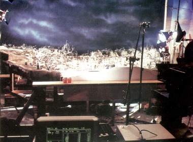 The Introvision setup used a sixty foot tall Scotchlite front-projection screen at the back of the stage, that bounced back virtually all of the light it received. Various miniatures & background plates were shot on Vista Vision, which offered twice the negative size of 35mm giving a finer grain and a more convincing composite with the live action footage. The pre-shot plates were projected on to the screen through the same camera lens as was filming the scene, so everything would align perfectly. The footage filmed in the camera, would be the finished composited image without any further need for film post-processing. The stage could also have a number of silver painted elements in the foreground which were similarly projected on to such as scenic items like rocks, walls or trees, allowing an actor to seemingly move behind and in front of elements in the projected image. The light wasn't bright enough to register on the actors clothing, and their bodies blocked their own shadows on the screen. Unlike blue/green screen matte shots which have to be composited together before the final effect can be appreciated and can take a few weeks, using Introvision, the finished effect can be seen through the camera's viewfinder immediately.