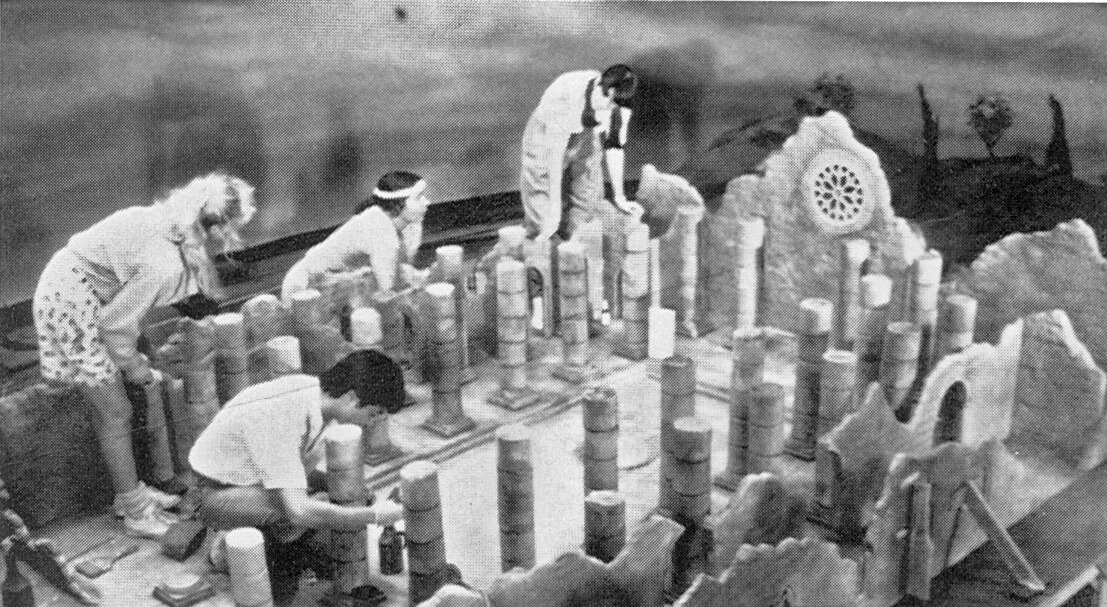 Many of the miniature scenic elements were designed by Tony Tremblay, who was initially brought in to specifically design the castle, but went on to become a general production designer. He started in January of 1991 by talking to Sam and producing some initial sketches, then made miniature mock-ups, before gaining approval to make the fully sized & detailed miniatures. The shooting schedule was arranged so that the miniatures were shot a month before principal photography began, to allow time for developing & editing, before the footage would be needed for projection at Introvision. Some sets never made into the finished film such as the volcanic chamber which was originally proposed to house the three books, and a ruined temple set. His work from start to finish took around eight months, and encompassed 20 miniature sets altogether.