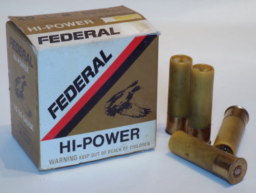 Original Federal Hi-Power shotgun shells box, with fired & inert shells