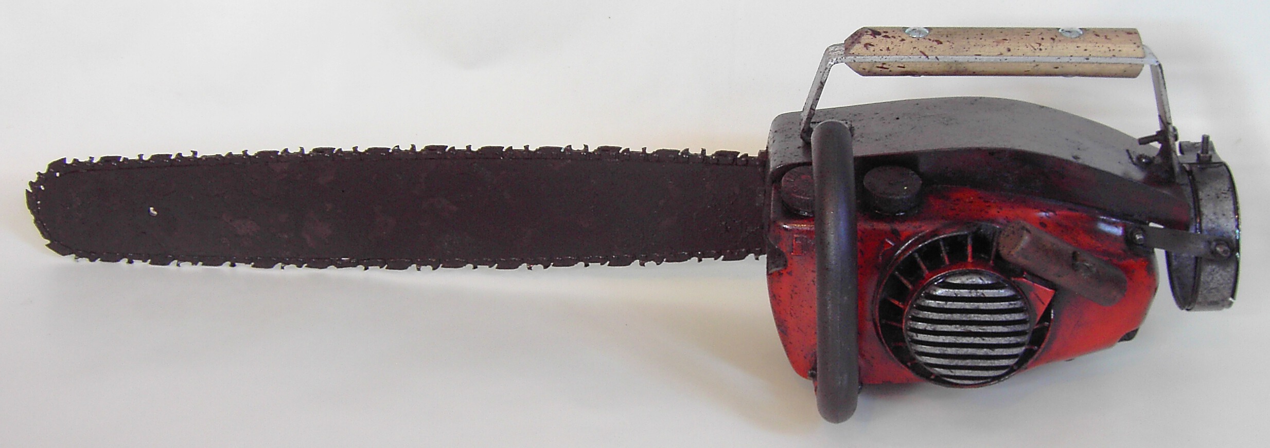 My own personal EvilDeadChainsaws.com 'Cabin' model replica chainsaw, with a 'light splattered' blood finish and a sharp chain