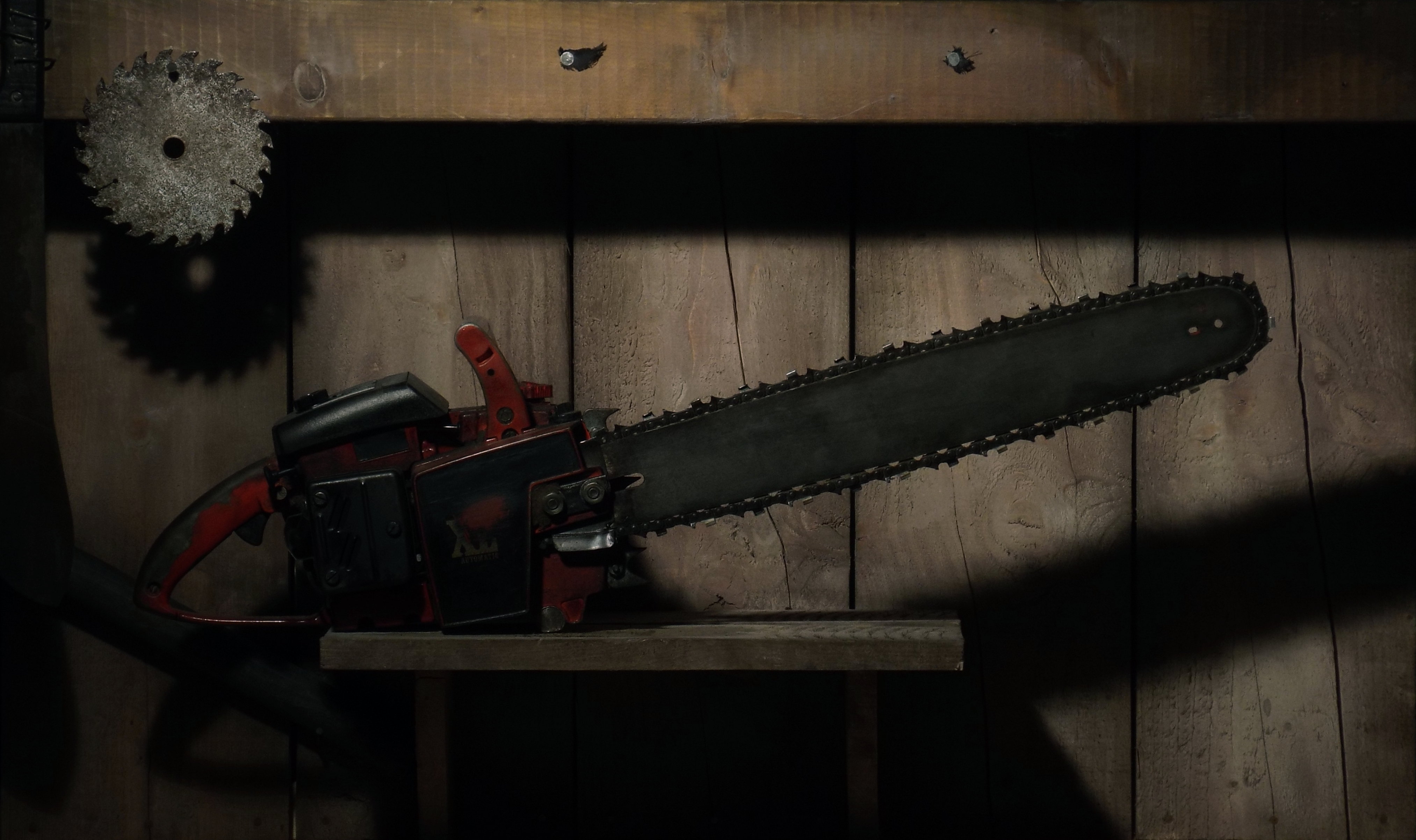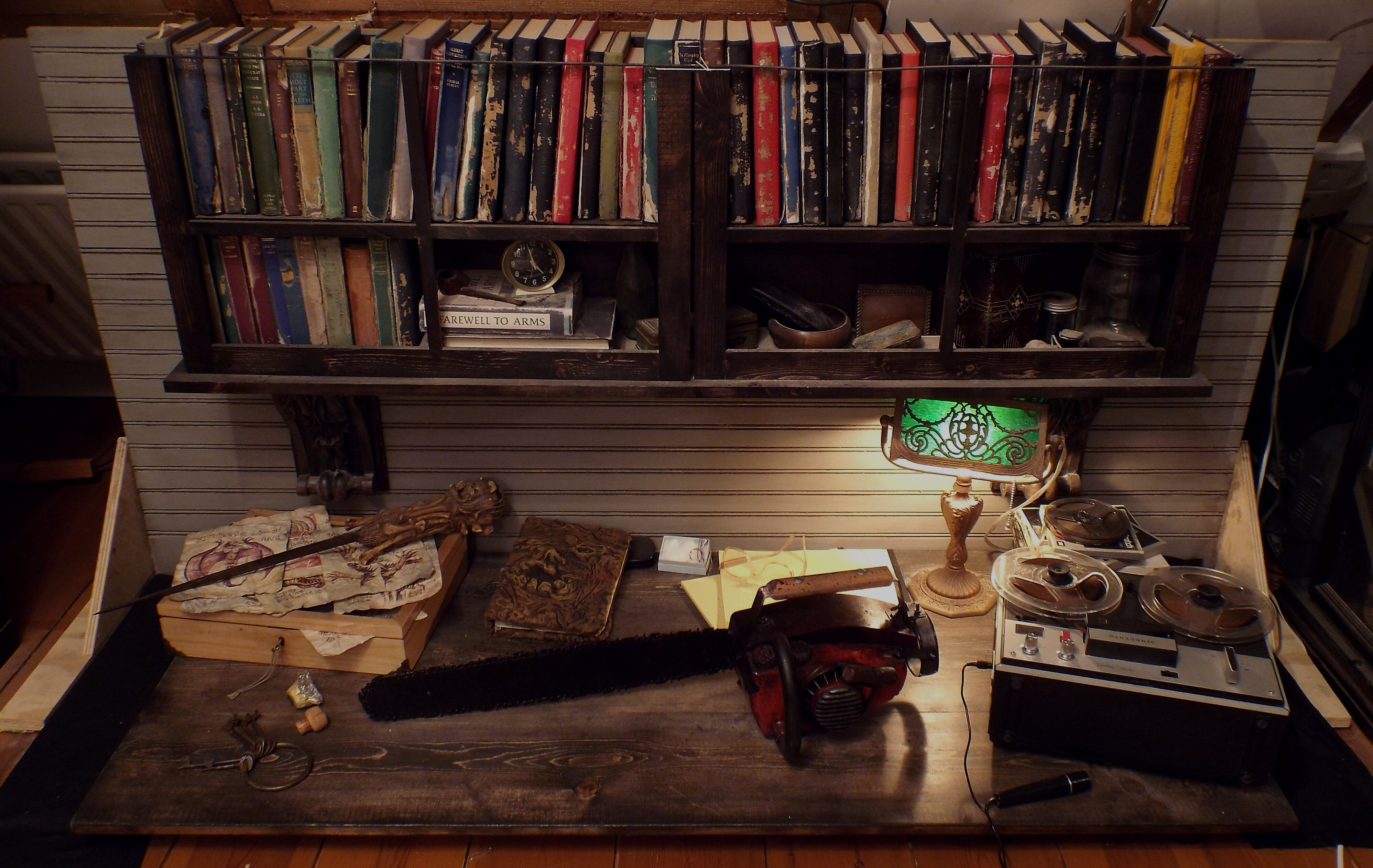 The EvilDeadChainsaws.com 'Cabin' model chainsaw desk display backdrop