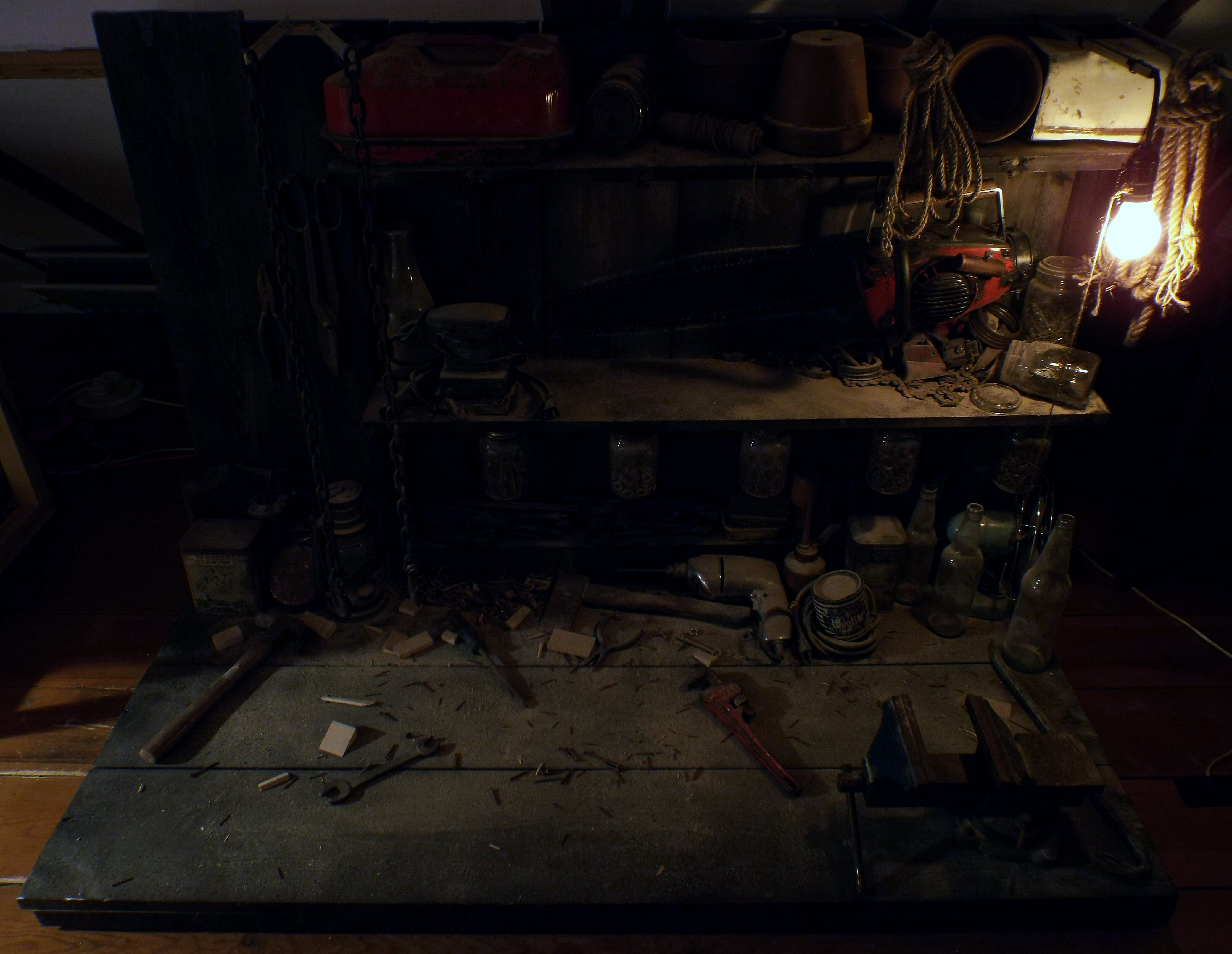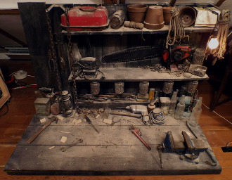 The EvilDeadChainsaws.com 'Workshed' model chainsaw workbench display backdrop